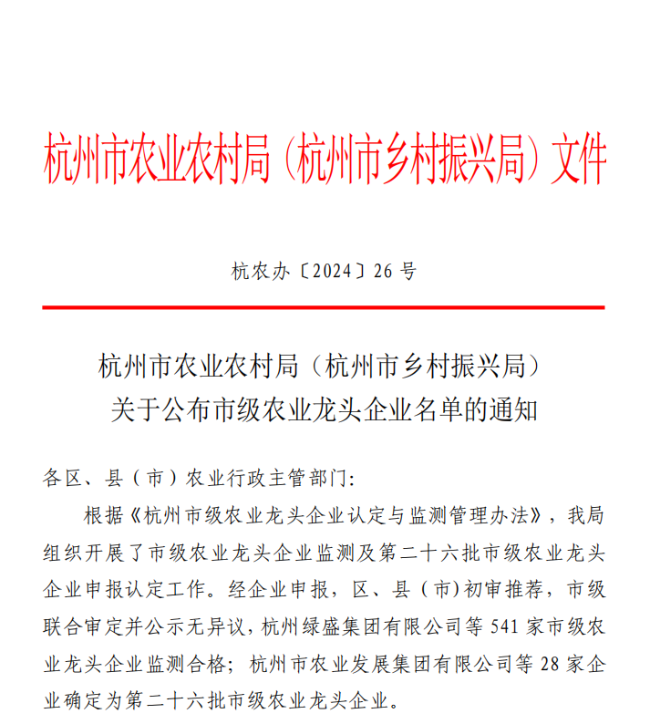 喜訊!浙江土畜下屬惠靈、惠隆公司獲評杭州市市級農業龍頭企業