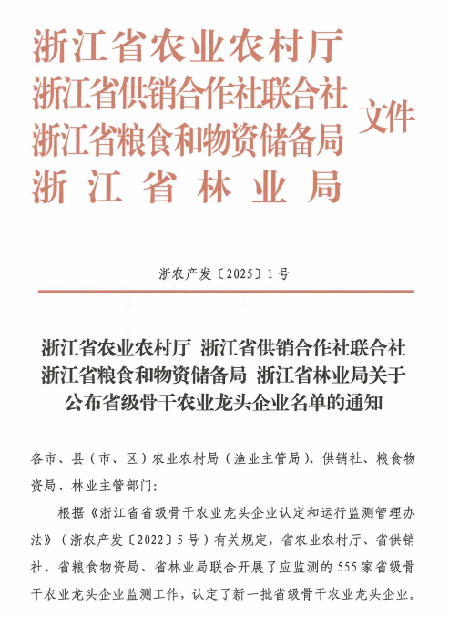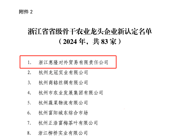 1月14日,省農(nóng)業(yè)農(nóng)村廳、省供銷社、省糧食物資局、省林業(yè)局四部門聯(lián)合印發(fā)通知,新認(rèn)定浙江惠隆對外貿(mào)易有限責(zé)任公司等83家企業(yè)為省級骨干農(nóng)業(yè)龍頭企業(yè)。