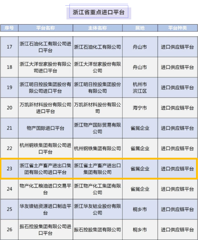 近日,浙江省商務廳公布了省進口貿易促進創新示范區和省重點進口平臺名單,作為國家農業產業化龍頭企業和省屬大型外貿企業,省土畜被評為浙江省重點進口平臺,成為浙江首批54個省級重點進口平臺之一,同時也是省國貿集團旗下唯一獲評的企業。